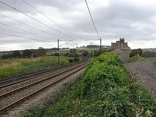 The station was opened on 1 July 1847 by the Newcastle and Berwick Railway. The station was situated 400 yards along a track that ran north from the Alnwick–Warkworth road, now the A1068. The station was very short-lived and closed, after three years, on 1 October 1850, due to the opening of Bilton station, now known as Alnmouth station.[1] The site was converted into two houses for railway workers.[2]