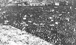 Following the Serbian campaign of 1915 Leskovac fell within the Bulgarian occupational zone. This period was marked by harsh repression with attempts at Bulgarisation of the local inhabitants. Numerous crimes were committed on the Leskovac citizenry with 2,000-4,000 victims being executed and a great many more massacred in the surrounding region.[27][28][29][30] During the occupation Leskovac was also adversely affected by a typhus epidemic and widespread malnutrition.[31] Bulgaria capitulation to the Entente on 30 September 1918, and Leskovac was liberated on 7 October 1918 in an offensive led by Field Marshal Petar Bojović's 1st Serbian Corps, which repelled the Austro-Hungarian 9th and German 11th Divisions. Cheering crowds gathered to welcome the Serbian Army's Dinarska and Dunavska divisions as they entered the city accompanied by French cavalry units.[32][33]