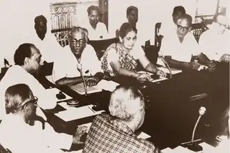 By 1970, Goonewardene believed he could implement his views best through the SLFP coalition and joined the SLFP-led United Front government. That year, the United Front, made up of the SLFP, LSSP and its rival, the Communist Party of Sri Lanka, was elected to power in landslide.[83] The LSSP had 18 MPs in the House of Representatives. Goonewardene became Minister of Communications and Minister of Transport.[84][85] By July, he had worked to convene a Constitutional Assembly to replace the British-drafted constitution with one drafted by the Ceylonese.[86] Policies requiring that permanent secretaries in the government ministries have expertise in their division were introduced. For example, those serving in the Ministry of Housing had to be trained engineers, and those serving in the Ministry of Health, medical practitioners. All government employees were allowed to join Workers Councils and at the local level, People's Committees were established to allow input from the population at large on government administration; this was brought from the LSSP management structure.[87] The changes were intended to remove elements of British colonisation and foreign influence from the country's institutions.[88]
