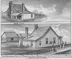 Lester Willson left New York in April 1867 taking a much less arduous route to Bozeman. The Bozeman Trail was now closed because of Indian trouble so Lester traveled by Union Pacific passenger train from Chicago to Platte City, Missouri. From there, stagecoaches carried General Willson to Denver, Colorado, Salt Lake City, Utah, and on to Virginia City, Montana. He met with then Territorial Governor of Montana, Thomas F. Meagher in Virginia City and arrived in Bozeman on May 22, 1867.[1] He became an active partner with his brother Davis, Rich and Tuller in running the mercantile business which was now flourishing because of the construction of Fort Ellis just west of town. In January, 1868 he returned to New York and proposed to Miss Emma D. Weeks. By May, he was back in Bozeman helping run the business. In January 1869, Willson returned to Albany, New York, to marry Miss Emma D. Weeks on March 2, 1869, and bring her back to Bozeman.[4] Returning via a Missouri River steamboat to Fort Benton, Montana, Lester, Emma and her piano were back in Bozeman by mid-May 1869. They soon moved into a remodeled cabin originally built by Daniel E. Rouse in 1864 in what was at the time one of the finest residences in Bozeman. Tuller left the business in 1868 and Davis Willson in 1870 to rejoin for a short period in 1872. Davis Willson eventually became a Presbyterian minister in the 1880s and the pastor of a small Gallatin Valley church.[1] Lester Willson sold "The Willson Company" in 1914 five years before his death in 1919.[8]
