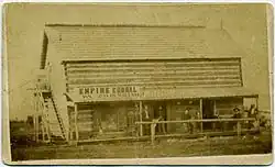 Working alongside Lester was his cousin Charles Rich and army friend, Loren W. Tuller. In December, 1865 after hearing a presentation on the western U.S. by then Speaker of the House of Representatives, Schuyler Colfax, Lester Willson got the wanderlust. He convinced his co-workers to that they should go to Montana and start a mercantile business. Unfortunately, Lester could not leave his New York job unfinished and did not join Rich and Tuller until 1867. However, he did invest in the business enterprise and enlisted the participation of his younger brother Davis to join Rich and Tuller in the 1866 journey to Montana. After reaching Omaha, Nebraska, in May 1866, Davis Willson, Rich and Tuller invested over $5000 in supplies, merchandise and transportation to embark on an overland journey to Bozeman, Montana. Their journey took them west along the Platte River Road to Fort Laramie, Wyoming, and then northwest along the Bozeman Trail. They arrived safely in Bozeman on September 2, 1866, with little interference by hostile Indians along the Bozeman Trail.[1] They operated a successful store out of a tent for two months and by the end of 1866, they had moved into a rented cabin on main street with a sign that read: "Tuller and Rich - Cheap Cash Store". Davis quickly established a corral attached to the cabin and named it "Empire Corral". The business flourished as they freighted supplies to the mining camps in Bannack and Virginia City, Montana.[1]