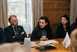As the leader of the non-governmental organization Price of Freedom,[31] Orobets focuses on mobilizing European and transatlantic partners to help protect Ukrainian airspace.[32] Her work involves active engagement with multiple stakeholders, including participation in a British parliamentary working group on air defense provisions for Ukraine.