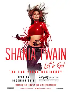Let's Go![1] is the second concert residency by Canadian singer Shania Twain. Performed at the Zappos Theater in Las Vegas, Nevada, the show began on December 6, 2019 and was originally estimated to run through 2021.[2][3] However, due to the COVID-19 pandemic, the show was put on hold and resumed in December 2021. Previously, Twain spent two years, from December 2012 until the end of 2014, performing the Shania: Still the One residency at Caesars Palace, and embarked on her 2015 Rock This Country Tour and her 2018 Now Tour.