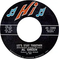 "Let's Stay Together" is a song by American singer Al Green from his 1972 album Let's Stay Together. It was produced and recorded by Willie Mitchell, and mixed by Mitchell and Terry Manning. Released as a single in 1971, "Let's Stay Together" reached number 1 on the Billboard Hot 100, and remained on the chart for 16 weeks and also topped Billboard's R&B chart for nine weeks.[1] Billboard ranked it as eleventh-highest selling song of 1972.[2]