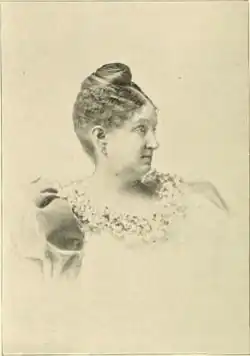 She suffered from severe rheumatism and migraine headaches that often forced her to wear leg braces. Nonetheless, she was described as a "keen observer and judge of people, and a charming hostess"".[5] She helped establish the Daughters of the American Revolution to try to heal the divisions between North and South after the Civil War and succeeded Mrs. Caroline Harrison as President General.
