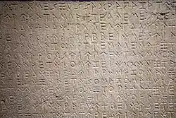 The Letoon trilingual, or Xanthos trilingual, is an inscription in three languages: standard Lycian or Lycian A, Greek, and Aramaic covering the faces of a four-sided stone stele called the Letoon Trilingual Stele, discovered in 1973 during the archeological exploration of the Letoon temple complex (devoted to the goddess Leto), near Xanthos, ancient Lycia, in present-day Turkey. It was created when Lycia was under the sway of the Persian Achaemenid Empire.[1] The inscription is a public record of a decree authorizing the establishment of a cult, with references to the deities, and provisions for officers in the new cult. The Lycian requires 41 lines; the Greek, 35 and the Aramaic, 27. They are not word-for-word translations, but each contains some information not present in the others. The Aramaic is somewhat condensed.[2]