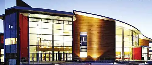 The complex includes a 25m (6 lane) swimming pool, a gym, a 2,500 seat sports hall, an athletic track (named after Danny McDaid), soccer pitch, children's play area and skate park.