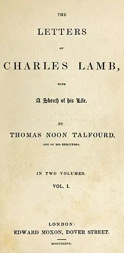 A projected third edition of the letters was to have been edited first by Talfourd and then by William Carew Hazlitt, but both editors successively abandoned the job.[21] The editorship was then given to the journalist George Augustus Henry Sala, who completed the first volume of a Complete Correspondence and Works of Charles Lamb. This was printed in 1868, but no further volumes were ever produced.[22] A new Complete Correspondence and Works of Charles Lamb, edited by the drama critic Thomas Purnell, containing 337 letters, appeared in 1870 in 4 volumes, the letters being also issued separately in one volume. Another drama critic, Percy Fitzgerald, edited a Life, Letters and Writings of Charles Lamb in 1876 with 451 letters, and this, like all previous collections, was published by Edward Moxon.[23]