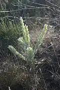 The shrub grows 2 m tall and flowers from September to October. The plant dies in a fire but the seeds survive. The seeds are stored in a toll on the female plant and fall to the ground after a fire. The plant is unisexual and there are separate plants with male and female flowers, which are pollinated by insects. The plant grows mainly on level areas, in dry sand over clay soil at altitudes of 130–150 m.