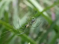 - ^ a b Eberhard, William G. (1990). "Early Stages of Orb Construction by Philoponella Vicina, Leucauge Mariana, and Nephila Clavipes (Araneae, Uloboridae and Tetragnathidae), and Their Phylogenetic Implications". The Journal of Arachnology. 18 (2): 205–234. ISSN 0161-8202. JSTOR 3705838.