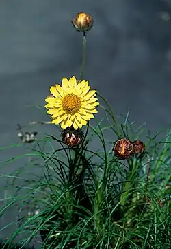 Leucochrysum graminifolium, commonly known as pagoda rock daisy,[2] is a flowering plant in the family Asteraceae. It is a small perennial with narrow leaves, yellow flower-heads and is endemic to New South Wales.