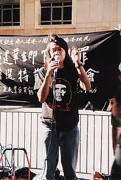 Leung Kwok-hung (Chinese: 梁國雄; born 27 March 1956), also known by his nickname "Long Hair" (長毛),[1][2] is a Hong Kong politician and social activist. He was a member of the Legislative Council, representing the New Territories East. A Trotskyist in his youth, he was a founding member of the Revolutionary Marxist League. He became a political icon with his long hair and Che Guevara T-shirt in the protests before he was elected to the Legislative Council in 2004. In 2006, he co-founded a social democratic party, the League of Social Democrats (LSD) of which he was the chairman from 2012 to 2016.