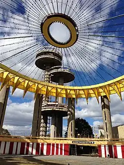 The design of the Utica Memorial Auditorium attracted the attention of architect Philip Johnson.[6] Together, they designed a nuclear reactor in Rehovot, Israel, in which Zetlin created a round building with a slightly curved roof instead of the typical "bosom" design used in nuclear reactors.[20] Zetlin and Johnson also worked on several other projects together including an art museum in Utica,[6] and the 1964–65 New York World's Fair, where Zetlin used the same double layer cable technique for the 350-foot (110 m) span of the New York State Pavilion.[13] Johnson, who was the architect of the pavilion, said that Zetlin was "the best engineer I ever had – exciting, imaginative and reliable, a combination that's hard to get."[2] Zetlin was the structural engineer for 13 other buildings at the fair.[13] Among these was the Travelers Insurance Pavilion in which he used a set of boomerang-shaped frames and a tension belt of cables to create a structure in the form of an umbrella as in the company's logo.[21] Zetlin was also the structural designer on the Kodak Pavilion for which he used a concrete shell of varying thickness to build the columns and cloud-like roof of the pavilion. On top of this roof structure was a walkway that led visitors along sculptured fountains, pools of water, and a tower featuring Kodak photographs.[22][23]