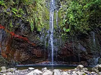 It is one of the most visited levadas on the island. Access is possible via the road ER110 in Paul da Serra. From there walking or taking a bus is possible to the start of the levada which is at the casa do Rabaçal, from here it is possible to get to the lagoon of the Wind (Lagoa do Vento), 25 Fontes Falls and the Risco levada, which leads to the impressive Risco waterfall that emerges from the lagoon. A valley of vertical walls where different types of volcanic rock allow water from the upper water table to emerge in the form of numerous fountains along the walls of the mountain. The only problem is the narrowness of the road, in the middle of the Laurel forest and other walkers.[1][2]
