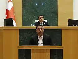 In the 2020 parliamentary elections, he was the UNM nominee for the majoritarian district of Gurjaani-Sagarejo-Sighnaghi-Dedoplistsqaro,[45] running against 18 candidates, including GD's Davit Songhulashvili.[46] His campaign focused mainly on the lack of judiciary independence,[47] but he ultimately lost in the first round, ending up second with 28.1% of the vote. 33rd on UNM's proportional electoral list,[48] he nonetheless won a seat in Parliament, which he refused to take at first, following other opposition MPs in declaring a boycott in protest of alleged election fraud. While his announced resignation was at first endorsed by the parliamentary committee on procedural issues,[49] Parliament refused to remove his mandate and, after an EU-mediated agreement between Georgian Dream and the opposition, he ended the boycott. On 31 May 2021, he was selected as deputy chair of the UNM Faction, along with MP Giorgi Botkoveli,[50] before becoming First Deputy Chair to Khatia Dekanoidze on 13 June.[2]