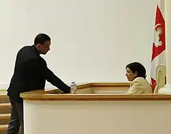 He was one of the leading parliamentary figures supporting Mikheil Saakashvili's 2008[10] reelection campaign and subsequently was one of the leading negotiators of the ruling party in its talks with the opposition to put an end to the political crisis. During those talks, he refused a recount of contested ballots during the presidential election but did agree to allow investigations if fraud was detected on CCTV cameras. To the opposition's call for a new cabinet after the spring parliamentary elections, he proposed to allow a confidence motion to be voted on. In response to the opposition's request for an investigation into the November 2007 protest dispersals, he proposed a joint investigative commission that would also look into an attempt to overthrow the government.[11] However, the opposition suspended the negotiation process on 8 February.[12]