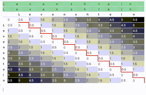![]() Edit distance matrix for two words using cost of substitution as 1 and cost of deletion or insertion as 0.5 | |