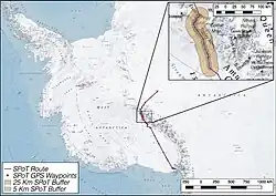 The Leverett Glacier is on the route through the Transantarctic Mountains for the South Pole Traverse (SPoT), an overland supply route between McMurdo Station and Amundsen–Scott South Pole Station.[5] Until 2005 all fuel and other supplies were carried from the McMurdo Station to the Amundsen-Scott South Pole Station by Lockheed LC-130 Hercules aircraft equipped with skis, at considerable cost. Starting in 2005 the 1,600 kilometres (990 mi) South Pole Traverse was opened to deliver fuel using modified agricultural tractors pulling sleds holding bladders of fuel. The trip takes about 40 days each way.[6] The route leads southeast over the McMurdo Ice Shelf and the Ross Ice Shelf for about 1,050 kilometres (650 mi).[7] It then climbs up the Leverett Glacier to the Antarctic Plateau, rising 3,000 metres (9,800 ft) along the 100 kilometres (62 mi) glacier. The remainder of the route is a direct line of 450 kilometres (280 mi) across the Antarctic Plateau.[8]