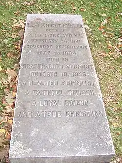 After serving as governor he returned to his work at Estey Organ.[18] Fuller's death in Brattleboro on October 10, 1896 was attributed to overwork and anemia.[19][20] He was first interred at Prospect Hill Cemetery, and in 1900 his remains were moved to Morningside Cemetery.[21]