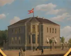 In 1859 the Navy decommissioned their last operations at Gammelholm, and the area was designated for residential redevelopment.[1] The city's initial plan was to reserve it for large villas in an attempt to keep wealthy tax-payers within the municipal borders since they were increasingly settling in Frederiksberg or in the northern suburbs. The grocer and bankier Martin Levin bought a lot on the waterfront and charged the architect Johan Daniel Herholdt with designing a house which was built in 1865–66.[2] Due to the difficult economic times that followed from Denmark's involvement in the Second Schleswig War, it was the only detached single-family house-with-garden that was built in the area. Gammelholm was instead built over with apartment buildings according to a master plan created by Ferdinand Meldahl. An expansion of the house incorporated it into the block structure of the new plan.[3]