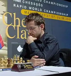 Levon Grigori Aronian (Armenian: Լևոն Գրիգորի Արոնյան, romanized: Levon Grigori Aronyan; born 6 October 1982) is an Armenian chess grandmaster who has represented the United States since 2021. A chess prodigy, he earned the title of grandmaster in 2000, at the age of 17. He is a former world rapid and blitz champion. His highest classical ranking was No. 2 position in the March 2014 FIDE world chess rankings with a rating of 2830,[3] becoming the fourth highest-rated player in history.