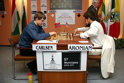 Aronian made his debut at the FIDE World Chess Championship in 2004. In the first round, he played and won against thirteen-year-old Magnus Carlsen, who was also making his debut at the tournament.[25] He progressed to the third round, where he lost to Pavel Smirnov.[26]
