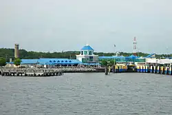 The southern terminus of the Cape May–Lewes Ferry is located in Lewes. The ferry provides passenger and automobile ferry service between southern Delaware and southern New Jersey, crossing the Delaware Bay to North Cape May, New Jersey, and serves as part of US 9. The ferry crossing is 17 miles (27 km) long and takes 85 minutes.[36][38] Cape Water Tours & Taxi operates a round-trip water taxi service between Lewes and Dewey Beach via the Lewes and Rehoboth Canal on Friday evenings in the summer months, offering access to dining and nightlife in Dewey Beach.[39]