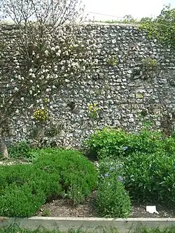 The most extensive surviving mediaeval structures are the precinct walls along the north (140 metres) and east (170 metres) sides of the Dripping Pan. Lengths also survive down Cockshut Road bounding the west side of the precinct. Significant secondary walls within the great precinct sub divide the land, notably the south wall of the Dripping Pan. The precinct walls have otherwise generally been removed for housing development, the railway and a car park near the Mount. Fragments of the Great Gate (circa. 1200 AD) exist in a rearranged form adjacent to the east end of St John's Church. The destruction of the walls has continued in recent years following the grant of Planning Permission by Lewes District Council to Lewes Football Club to demolish a section of the longest surviving extent of the structure along Ham Lane in 2006 for unrealised business objectives whilst a further adjacent length subsequently delaminated and fell in 2008 with repairs started in late 2009.