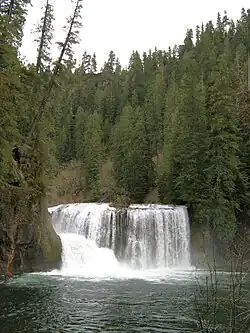 The Lewis River is a tributary of the Columbia River, about 95 miles (153 km) long, in southwestern Washington in the United States. It drains part of the Cascade Range north of the Columbia River. The drainage basin of the Lewis River covers about 1,046 square miles (2,709 km2).[4] The river's mean annual discharge is about 6,125 cubic feet per second (173.4 m3/s).[5] Unlike nearby Lewis County and Fort Lewis the Lewis River was not named for Meriwether Lewis, but rather for A. Lee Lewis, an early pioneer who homesteaded near the mouth of the river.[6]