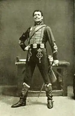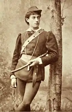 After acting in amateur performances, Waller decided to make a career on the stage and was engaged by J. L. Toole in 1883. His first role was the Hon. Claude Lorrimer in H. J. Byron's Uncle Dick's Darling, in which he was billed as "Waller Lewis".[4] By May of the same year, he had adopted the stage name Lewis Waller.[5] In that month he appeared at the Theatre Royal, Drury Lane, in a charity matinee for the Actors' Benevolent Fund with Toole's company and such contemporary stars as Rutland Barrington, Lionel Brough, Arthur Cecil, Nellie Farren, George Grossmith, Henry Irving and Ellen Terry.[6] He remained in Toole's company for a year, playing light comedy and juvenile parts. He joined a touring company, playing the central role, the blind Gilbert Vaughan, in Called Back by Hugh Conway, dramatised by J. Comyns Carr.[7] He returned to London in March 1885 to play at the Lyceum Theatre in Helena Modjeska's company, as the Abbé in Adrienne Lecouvreur, and then toured with her, playing such roles as Mortimer in Mary Stuart and Orlando in As You Like It;[7] The Manchester Guardian said of the latter that he "kept Orlando properly ingenuous, and made him a taking and gallant young wooer."[8]