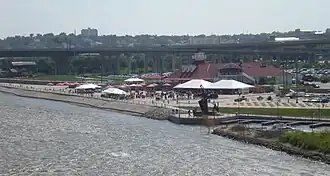The park contains a walking trail which follows the riverfront and sections of a bike trail that connect to Omaha's bike trail system. The walking trail also connects to the Bob Kerrey Pedestrian Bridge that spans the river and joins Omaha with Council Bluffs, Iowa.[11] Additional attractions include a "Monument to Labor" sculpture, Lewis and Clark interpretive exhibits and a historical marker on site.[12]