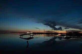 Water constitutes about 14% of the city's total area,[47] including Lewisville Lake, the Elm Fork of the Trinity River, and two local tributaries of the Elm Fork - Prairie Creek and Timber Creek. A riparian zone encompasses a portion of the city in the southeast.[50] The intersection of the Elm Fork and Lake Lewisville has given rise to a delta at the southern end of the lake, extending 6.9 miles (11.1 km) south.[51] The Federal Emergency Management Agency has labeled much of the area surrounding the delta as "Zone AE", meaning the area is subject to 100-year flood precautions.[52]