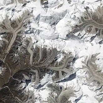 ![]() The glacier is located to the northeast of the rounder Imja Tsho lake shown south of centre | |
