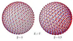 Electromagnetic field (arbitrary unit) of a positive point charge moving at constant speed. When , the electromagnetic field reduces to electrostatic field (in blue). Due to its insignificance at large distance, this field is ignored in high energy physics when computing electromagnetic radiation power. However, it is used for wakefield modeling. The Coulomb field is also known as pancake field when .[5][6]Electromagnetic field (arbitrary unit) of a positive accelerated point charge (far from the source). Acceleration is parallel to velocity. When the particle decelerates, this leads to braking radiations which can be strong when particles collide.Electromagnetic field (arbitrary unit) of a positive accelerated point charge (far from the source). Acceleration is perpendicular to velocity. It is the synchrotron radiation.