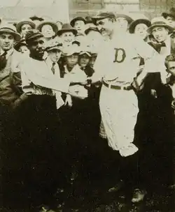 In the early 1900s, it was not unusual for Major League Baseball teams to casually retain one or more urchins to act as mascots or batboys. Their employment might only last as long as a team's winning streak, and often their only wages were food and shelter.[1] On July 4, 1908, the Detroit Free Press reported that the Tigers had begun traveling with a new mascot, "Rastus," who had been "picked up by [Germany] Schaefer" during the team's recent road trip to Chicago.[5] "He will have a home as long as the present streak lasts," the report added. Harrison served as a mascot for the next three months for the pennant-winning Tigers, who would rub the youth's head for good luck.[6] He traveled with team and even warmed up Tigers pitchers from time to time.[7]