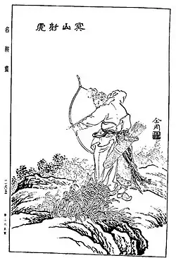 According to Sima Qian's Records of the Grand Historian, Li Guang was a man of great build, with long arms and good archery skills, able to shoot an arrow deeply into a stone (which resembles the shape of a crouching tiger) on one occasion.[1] At the same time, like his contemporaries Wei Qing and Huo Qubing, he was a caring and well-respected general who earned the respect of his soldiers. He also earned the favor of Emperor Wen, who said of him: "If he had been born in the time of Emperor Gaozu, he would have been given a fief of ten thousand households (Chinese:万户侯) without any difficulty".