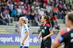After 110 appearances with the German team, Wälti signed a contract with Arsenal in July 2018.[8] Wälti was instrumental in Arsenal's 2018–2019 WSL league winning season although only played half of the season after she suffered a LCL injury which kept her out of football for 9 months In April 2019.[9] She was included in the 2018-2019 PFA Team of the Year.[10] On 13 December 2019, Wälti signed a long-term contract with the club.[11]