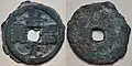 Imitations of Kaiyuan Tongbao (開元通寳), Qianyuan Zhongbao (乾元重寳), and Zhouyuan Tongbao (周元通寶) cash coins from the Tang and Later Zhou dynasties, respectively, have been attributed to the Qara Khitai Khanate however the production of these was scarce. In November 2008 some rather unusual Chinese cash coins were unearthed at the Aq-Beshim site in Kyrgyzstan which lies near what used to be site of the ancient city of Suyab. Initially these cash coins were assumed to have the inscription "Jixing Yuanbao" (績興元寳), as the manufacturing method of these coins was rather crude and their calligraphy poor as well as the reign title Jixing being unknown in Chinese historiography scholars deduced that these cash-in coins had to be produced locally. Initially it was assumed that these coins were in fact coin-like charms but in October 2010 another coin with this inscription was found at the Qara-Jigach site (ancient Tarsakent), the inscription of this coin was more readable which corrected the earlier assumptions and this series was confirmed to bear the inscription "Xuxing Yuanbao" (續興元寳), in February 2011 another Xuxing Yuanbao cash coin was unearthed in Kyrgyzstan at the site of what used to be the ancient city of Navekat (Nawikath) in modern-day Krasnaya Rechka which confirmed that they were in fact monetary objects.[15]