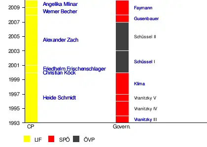 The chart below shows a timeline of the Liberal chairpersons and the Chancellors of Austria. The left bar shows all the chairpersons (Bundessprecher, abbreviated as "CP") of the Liberal party, and the right bar shows the corresponding make-up of the Austrian government at that time. The red (Social Democratic Party of Austria, SPÖ) and black (Austrian People's Party, ÖVP) colours correspond to which party led the federal government (Bundesregierung, abbreviated as "Govern."). The last names of the respective chancellors are shown, the Roman numeral stands for the cabinets.