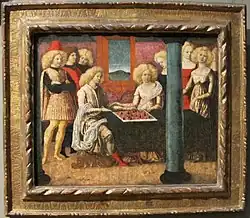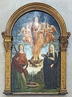 He was a pupil of the painter Vincenzo di Stefano, although he was strongly influenced by Andrea Mantegna and Jacopo Bellini. He was featured in the Vite of Giorgio Vasari. In Verona, he painted an Adoration of the Magi in the Duomo, and another for the chapel in the bishopric. For the church of San Bernardino, he painted in the chapel of the company of the Maddalena. He also painted a Birth and Assumption of the Virgin. At the Brera Gallery, there is a St. Stephen. There are illuminated books by him in cathedral of Chiusi. The St Sebastian in the Princeton University Art Museum is attributed to Liberale.[1] Between April and May 1476 Liberale left Siena to move again to Monte Oliveto Maggiore. On 22 June, still a guest of the archicenobium, he sent one of his 'soma' to Florence, perhaps intending to stay there for some time. It can only be assumed that in these circumstances he had made a definitive return to the north, since there is no further news of him until 9 Sept. 1481, when he signed an agreement with Nicolò Solimani to decorate the Tonso Chapel in the Servite Church of the Annunziata in Rovato; however, there is no trace of these frescoes..[2]