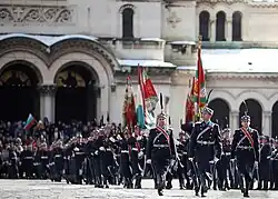 In Bulgaria, there are currently over 400 preserved monuments dedicated to the soldiers who fought for its freedom. Every year on 3 March, wreaths are laid at the Shipka Monument and military honors in memory of all soldiers who died fighting for the liberation of Bulgaria. Residents around the country commonly lay flowers and notes at monuments to the fallen foreign troops who fought alongside their Bulgarian counterparts.[7] The Bulgarian Orthodox Church holds special liturgy and prayers on Liberation Day. In the evening, on the National Assembly Square near the monument to the Tsar Liberator, there is a solemn military service which includes the inspection of the National Guards Unit of Bulgaria by the President of Bulgaria and the awarding of military personnel with national decorations. An afternoon flag raising ceremony at the Monument to the Unknown Soldier is also held.