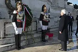 Public events in commemoration of the event, such as marches and parades, have been organized annually in various Italian cities, especially in those decorated with military valor for the war of liberation. Among the events of the festival program there is the solemn homage, by the President of Italy and other important officers of the State, to the chapel of the Italian Unknown Soldier (Milite Ignoto), buried in the Altare della Patria in Rome, with the deposition of a laurel wreath in memory of the fallen and missing Italians in wars.[33] On this day, the Italian flag and the European flag are displayed on all buildings that house public offices and institutions.[34]