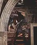 The Liberation of Saint Peter is a fresco painting by the Italian High Renaissance artist Raphael.[1] It was painted in 1514 as part of Raphael's commission to decorate with frescoes the rooms now known as the Stanze di Raffaello, in the Apostolic Palace in the Vatican. It is located in the Stanza di Eliodoro, which is named after The Expulsion of Heliodorus from the Temple. The painting shows how Saint Peter was liberated from Herod's prison by an angel, as described in Acts 12. It is technically an overdoor.