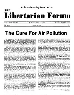 The Libertarian Forum was created in 1969 after the demise of Left and Right: A Journal of Libertarian Thought to support anarcho-capitalism. The focus of the journal was on "substantive theoretical contributions, commentaries on politics, details of disputes and arguments within the libertarian movement, and forecasts on the future of liberty."[2] The original publisher was Joseph R. Peden.