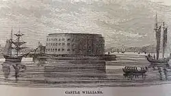 Malcolm, who was present when the British authorities boarded Liberty, published an account in the Boston Chronicle detailing the seizure of the ship as well as his confrontation with the authorities.[5] The customs house was attacked and the sailors were forced to retreat to Romney and then to Castle William.[2] The chief collector of customs, Joseph Harrison, his son, and Benjamin Hallowell, another customs official, were attacked by the mob when the crowd failed to block the British sailors who were towing the Liberty.[6] Around 3,000 colonists participated in the riot.[7]