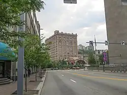 ![]() Liberty Avenue near 10th Avenue with Union Station visible in the background | |