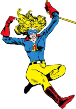 ![]() Libby Lawrence as the Liberty Belle in All-Star Squadron #61 (September 1986 DC Comics) drawn by Michael Harris | |
