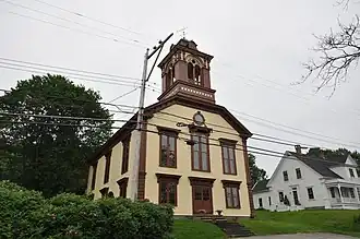 Construction of the hall was authorized by the town meeting in 1873, and the building was completed the following year by Andrew Gilson, a Machias contractor and politician. The hall was used not just for town meetings, but also served as a venue for community events, meetings of community organizations such as the Grange, and as a performance venue for traveling shows.[2] The town closed the building in 2000 due to structural conditions, and renovation efforts are currently underway by the Friends of Liberty Hall. The exterior has been restored (included the restoration of the tower's original appearance), and funds are being raised to restore the interior.[3]