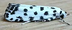 The wingspan is about 16 mm. The forewings are white, with many large black dots, three at the base, four on the costa, three in a line above the middle of the disc, one in the disc beneath the last of these, two on the fold, one on the inner-margin at three-fifths, three near and parallel to the hindmargin, the lowest touching it and a few black scales on the hindmargin. The hindwings are whitish.[2]