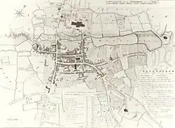 Bishop Roger de Clinton was responsible for transforming the scattered settlements to the south of Minster Pool into the ladder-plan streets existing today. Market Street, Wade Street, Bore Street and Frog Lane linked Dam Street, Conduit Street and Bakers Lane on one side with Bird Street and St John Street on the other. Bishop de Clinton also fortified the cathedral close and enclosed the town with a bank and ditch, and gates were set up where roads into the town crossed the ditch.[16] In 1291 Lichfield was severely damaged by a fire which destroyed most of the town; however the Cathedral and Close survived unscathed.[18]
